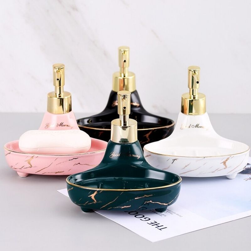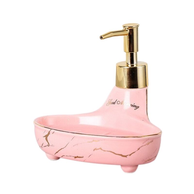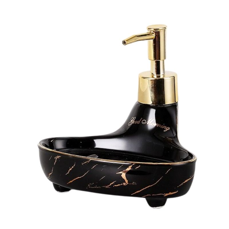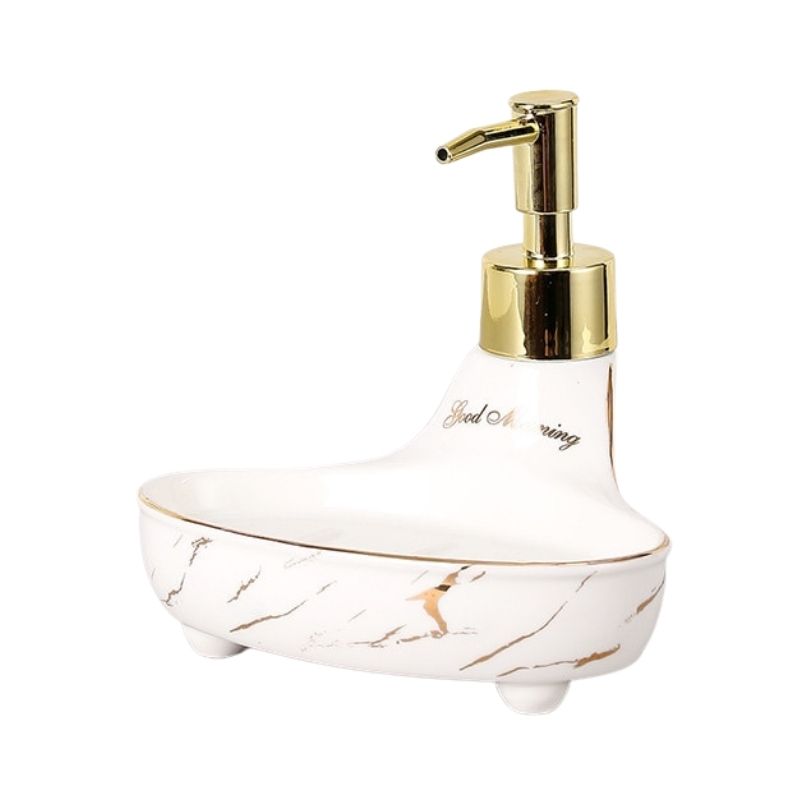 Il design di questo Dispenser con Portasapone Integrato Marmo è stato pensato per stupire. La base, con la sua finitura effetto marmo bianco e le venature dorate, evoca un'estetica raffinata e moderna, capace di adattarsi a qualsiasi stile di arredamento, dal classico al contemporaneo. La scritta "Good Morning" sulla parte superiore aggiunge un totere delicato e accogliente, ideale per iniziare la giornata con il piede giusto. Il dispenser in metallo dorato, oltre a essere robusto e durevole, completa l'aspetto lussuoso, creando un contrasto armonioso con la base in ceramica. Ogni dettaglio è curato per offrirti un'esperienza d'uso superiore.